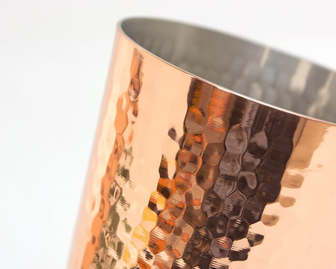銅を鎚(つち)で打ち起こす方法です。立体的な形は一枚の平らな銅板を鎚で打つことを繰り返し出来上がります。熟練工による高い技術はやかんのように注ぎ口の部分まで打ち出すことのできます。
